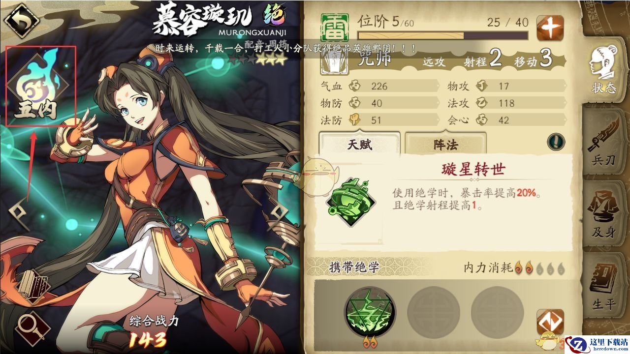 少侠在英灵详情页面的左上方「五内」入口即可进入五内系统。