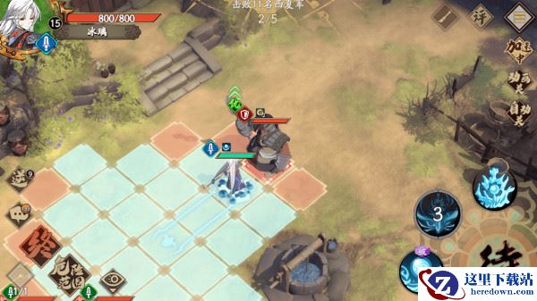 穿越后因为冰璃的天赋剑使威仪可以再次移动,这时候我们走到最右边小兵堆里释放大招,秒杀所有火属性小兵