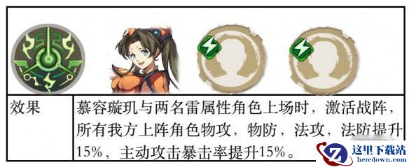 不过,夏侯阵法有个明显的缺点,如图所示对单体伤害缺乏加成,在对单体攻坚时难免吃亏。好在队伍中的慕容璇玑同样拥有阵法,而且是同样优秀的雷阵。因此在夏侯阵基础是,阵容构建引入雷阵,可以在面对不同类型关卡时灵活切换阵法。当然也可以多养几队人马,不同图不同人。