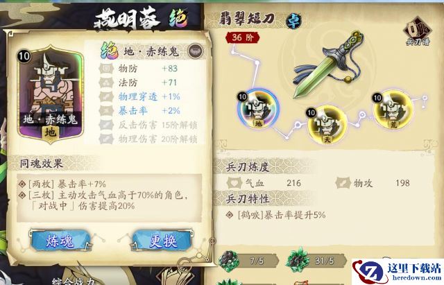 燕明蓉的武器魂石推荐用[赤练鬼]: [2枚]暴击率+7%: [3枚]主动攻击血量高于70%的角色,对战中伤害提高20%。作为刺客英灵就是为暴击而生,PVP中如果没有暴击很难杀人,[赤练鬼]的+7%暴击率可以增加燕明蓉的暴击几率。 同时“主动攻击血量高于70%的角色,伤害提高20%”最大提升刺客一击必杀秒满血脆皮的能力。