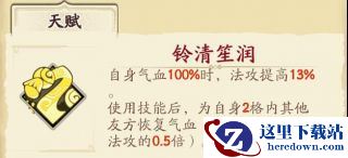 当封铃笙未受伤害100%满血的时候会获得额外提高的法攻百分比加成,这时给队友治疗的加血量也会更多。封铃笙每次使用任意技能后都能在自身周围2格范围内产生一个被动范围回血。满血时的法攻加成+使用技能后的天赋额外范围治疗+主动治疗技能的产生效果可以让封铃笙不管是单体治疗还是群体治疗都有很高的奶量。