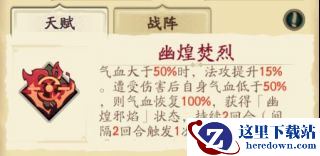 天赋的法攻提升直接加成在人物面板上,对单体和群体技能都有提升,要求大于50%的气血条件也非常宽松,战斗时的绝大部分时间都满足条件。当受到伤害后血量低于50%就会回满血,并获得除气血外全属性提高的[幽煌邪焰]状态2回合,让自己的爆发力更高并更肉,夏侯仪远离我方铁卫和祝由且被敌人围攻时,往往能依靠天赋存活下来。虽然[幽煌邪焰]有触发回合限制,但六星时只需要间隔2回合,升星收益很高。