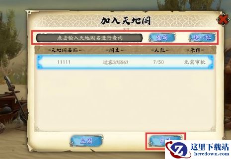 1、如果已经有了心仪的天地阁,可以在天地阁弹窗上方输入心仪的天地阁的部分或全部名称查询。