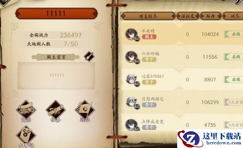 1、点击天地阁右侧的【成员】页签,可以查看到每一位成员信息,包括(名片、战力、在线状态)。