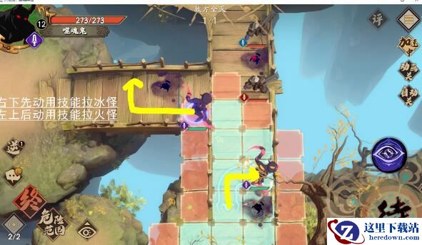 右下先动用技能拉冰怪左上后动用技能拉火怪