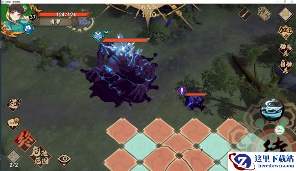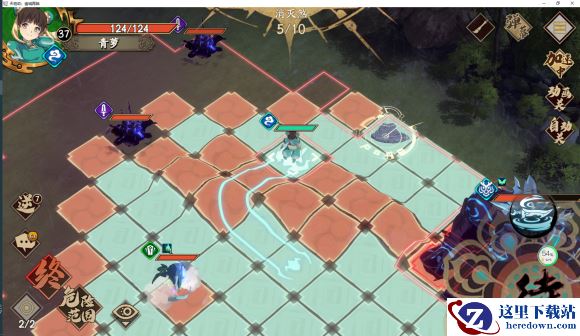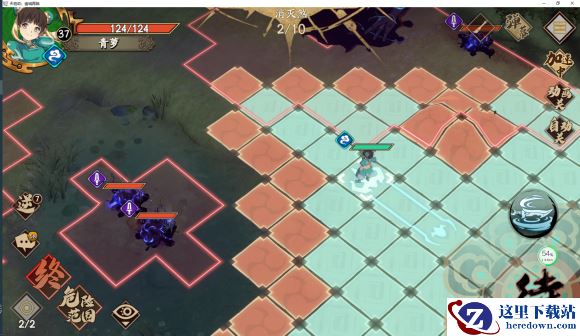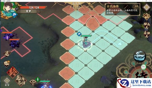 第五回合,法阵在危险范围内,因为还有一个法阵没踩,杀不了BOSS,青萝不能踩这个法阵,不然会被杀,游戏结束。