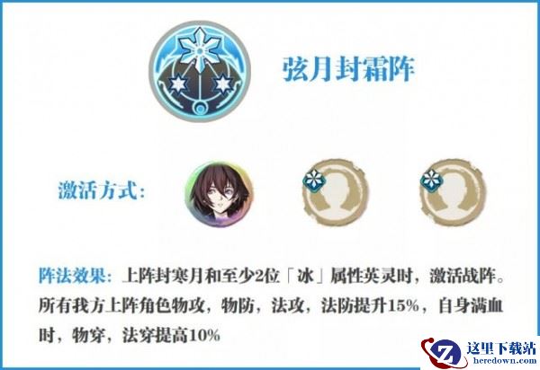 【弦月封霜阵】:属性增加15%,增伤条件为满血时物穿、法穿提升10%