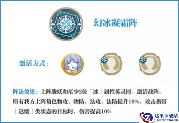 【幻冰凝霜阵】:属性增加10%,增伤条件为攻击【迟缓】状态的目标时,伤害提升10%