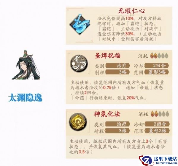 其次太渊隐逸还可以同时带上两个群补和群驱散的技能,不仅可以为友方英灵提供非常霸道的血量回复效果和驱散减益buff效果,同时配合其天赋【无瑕仁心】还可以做到群体的【霜铠】效果,这种能力在目前的游戏中也只有太渊隐逸一人可以做到