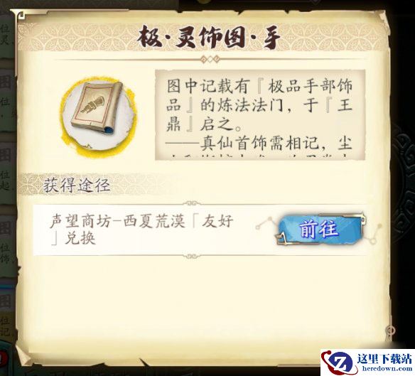 在山河志中,西夏荒漠声望达到友好后,在商店内购买手部饰品炼化图纸才可以解锁炼化手部饰品的功能。