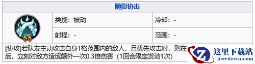 随影协击:协力技,若友方角色主动攻击自身普攻范围内的敌方,则在对战中双方交战后,给敌方造成一次额外伤害。