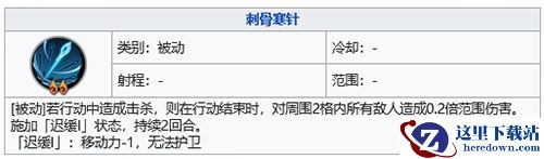 刺骨寒针:若行动中造成击杀,则在行动结束时,对周围一定范围内所有敌方造成伤害,并降低目标移动力,使其无法护卫。
