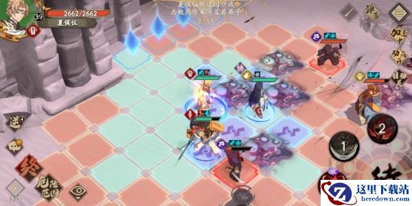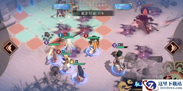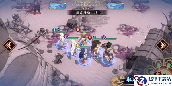 第4回合。夏侯仪上前加血刃普攻击杀雷剑客,殷剑平到医师右边普攻,韩无砂上前击杀医师。冰璃站在医师位置准备。