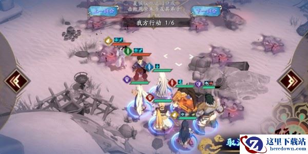 第5回合。韩无砂右走放群攻技能,解臾到韩无砂旁边护卫,夏侯仪上前给冰璃加血刃,冰璃到周崇左边2格放幽剑,然后再动对周崇放避实(如果不被击杀最好,如果被击杀也还有殷剑平挡着)。殷剑平到周崇左下放无方。敌动阶段,朱浩会击杀解臾,周崇会击杀残血冰璃或殷剑平。