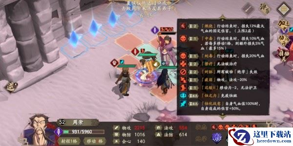 第6回合。韩无砂加血刃用技能攻击周崇,夏侯仪到殷剑平左边对周崇放离火。敌动阶段,朱浩会击杀韩无砂,周崇会攻击殷剑平(如果原地不动的话)。我选择把殷剑平往下走挡住刺客,然后周崇会普攻夏侯仪,然后被反击击杀。即使没有被击杀,20%+15%的毒发也可以带走他。