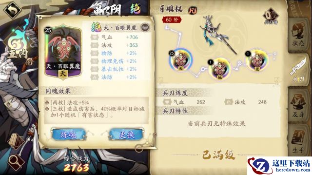 百眼翼魔三枚同魂效果可以在造成伤害有40%几率对目标多施加一个随机[有害状态],群体伤害技能也能触发。当郸阴用[噬魂之狱]给对面群体“禁疗”或者[灭魂大法]群体“封咒”时,有几率多施加1个有害状态,增加对面祝由的驱散难度。