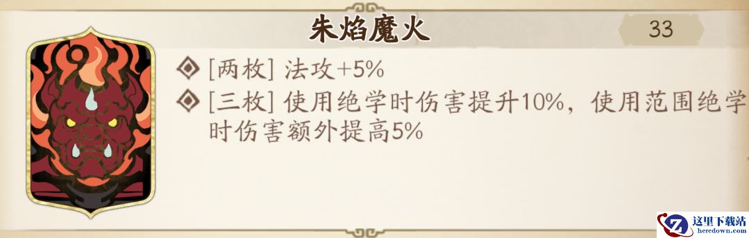 紫枫同时具备多个单点技能和AOE技能,朱焰魔火不管在使用单体技能还是范围技能时,提供的增伤效果较为实用。朱焰魔火的输出收益相对平稳,也可考虑选择。