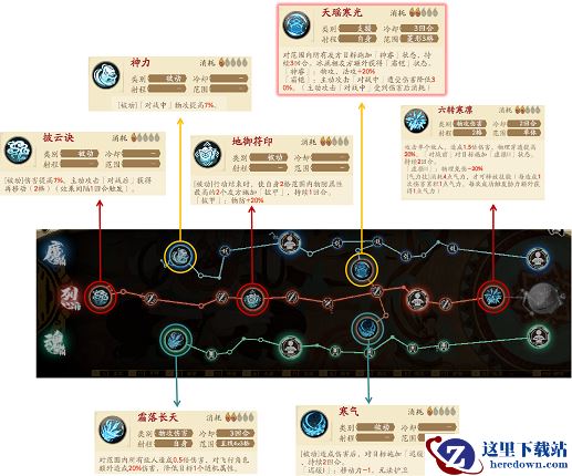 上路魔线解锁的另一个技能天瑶寒光技能是一个优质的辅助技能,可以使得自身范围内多名友军获得持续3回合的物攻、法攻提升20%的神睿效果,冰属性友军还可额外获得主动攻击对战中减伤的霜铠效果。