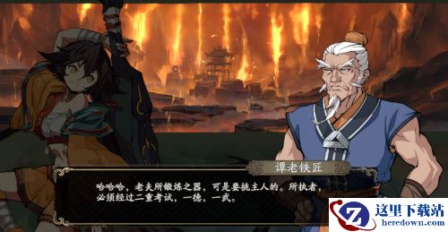 尉迟良应谛听之请,来调查赤炼渊附近突然出现的村落,救了火神祝融化身的谭老铁匠,赶跑了窃神器的方芸,得到了祝融的肯定,允诺他们以后带上好材料,来这铸剑之地,可助他们炼就神兵。