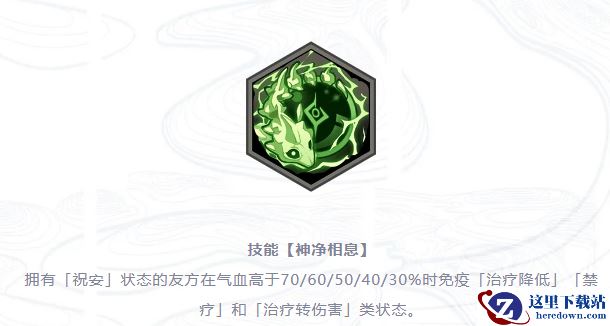 拥有「祝安」状态的友方在气血高于70/60/50/40/30%时免疫「治疗降低」「禁疗」和「治疗转伤害」类状态。