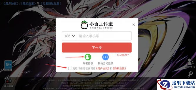 2、在弹出的页面中,购买最下方用户协议和隐私政策,然后点击右侧的账密登录。