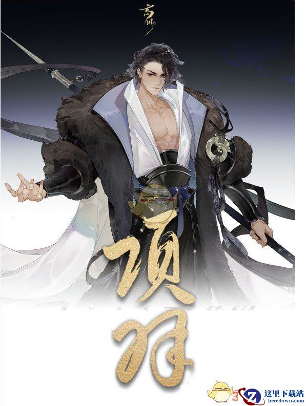 项羽身披乌羽战袍,袒露着线条分明的健硕胸腹。《 史记 》 载:籍长八尺余 』 力能扛鼎,才气过人,厚重的战袍衬托出他高大伟岸的身形,和肩膀一样宽广的也是他见秦皇仪仗言:彼可取而代之:的不凡志向。