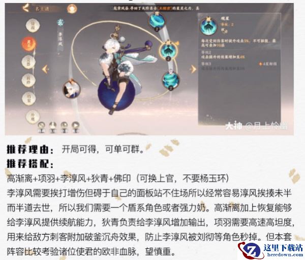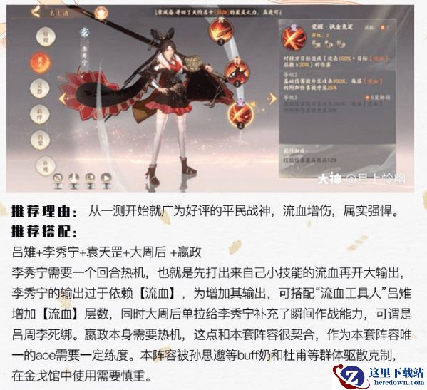 李秀宁是一个非常强力的攻击型名士,可以增加自身伤害,给对手添加流血BUFF。