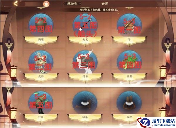 目前游戏中的文物分为橙色和蓝色两个品质,橙色的文物收集难度非常的大,下面就是所有文物的收集方法,都用红字标注在图中了。
