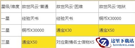 在故世风云中,我们每新通关一个关卡都有机会获得一定数量的通宝,每个副本难度下奖励通宝的数量、所需星级都不相同,分别为: