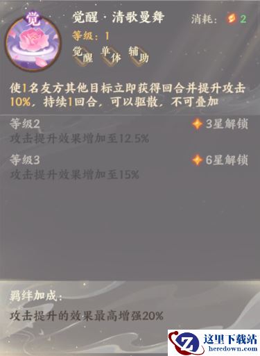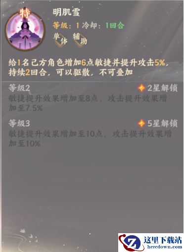 给1名己方角色增加6点敏捷并提升攻击5%,持续2回合,可以驱散,不可叠加