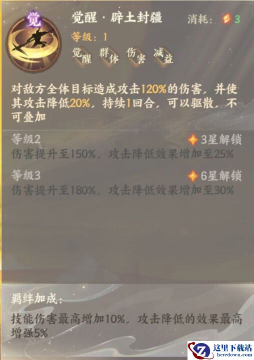 对敌方全体目标造成攻击120%的伤害,并使其攻击降低20%,持续1回合,可以驱散,不可叠加