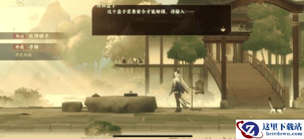 在左侧石桌(钓鱼的猫猫下面)上的黑色盒子里获得琴徽,密码三五八
