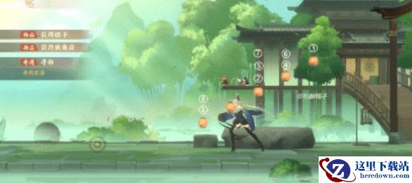 然后点击灯笼再次演奏,顺序: 1-3-5-4-3-4-3-1获得商音和徵音琴弦,进入幻境,在嵇康面前的石块上获得琴弦,在拱桥左边的柱子那获得琴弦,在竹林获得最后一个琴弦