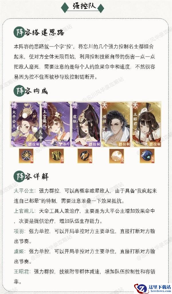 《忘川风华录》手游中有非常多的角色,阵容的搭配就非常重要,相信还有很多小伙伴不是很清楚强控队阵容怎么搭配。下面小编给大家带来忘川风华录强控队阵容搭配攻略,感兴趣的小伙伴们一起来看看吧!