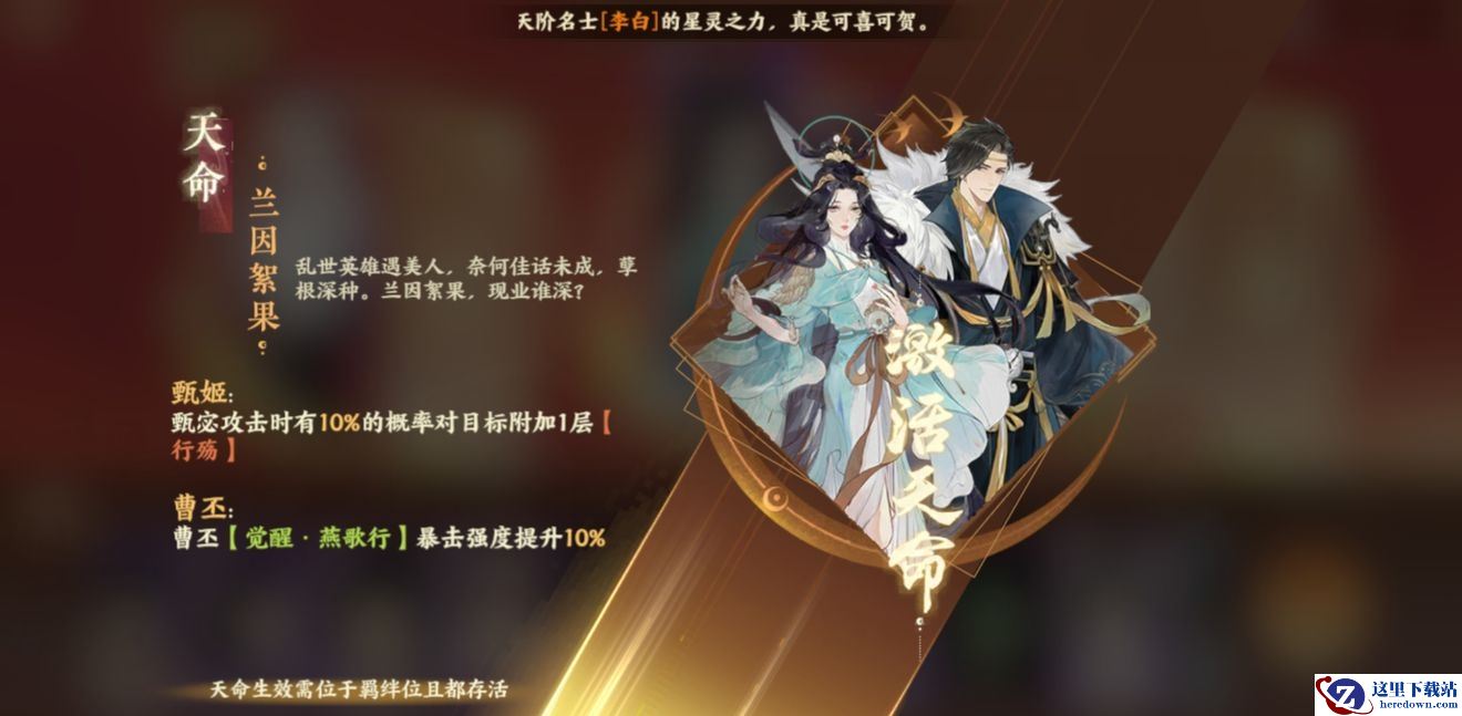 提起甄姬,不得不说的还有曹丕,在战场上,二人互相鼓气,为彼此激发天命技能,增强队伍的综合战斗力。其中,甄姬的天命技能为:甄姬攻击时有10%的概率对目标附加1层【行殇】,曹丕的天命技能为:曹丕【觉醒·燕歌行】暴击强度提升10%。