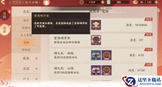 宠物数量、繁殖次数、玩具获得数量、小鱼干数量、猫咪回礼成就:铜币、猫玩具、名士经验书、铜币、信物宝匣。