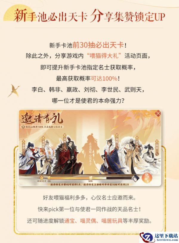 新手卡池前30抽必出天卡,参加喂猫得大礼活动,最高提升100%指定名士获取概率
