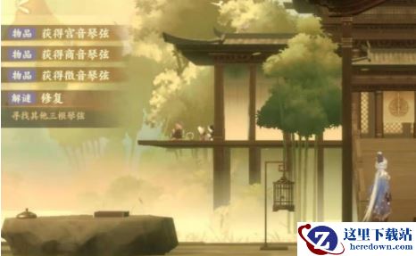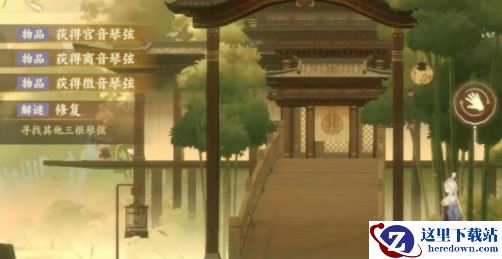 回到梦境,在鸟笼旁边的灯笼上得到宫音琴弦。梦境竹林里得到羽音琴弦。