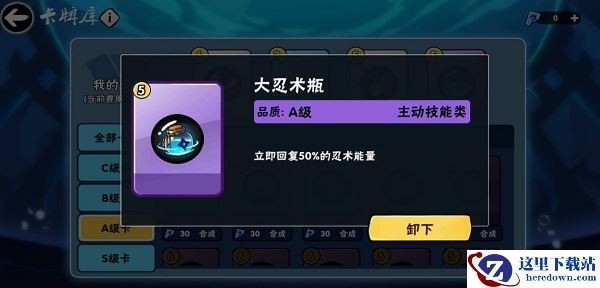 1、推荐大小忍术瓶+镰刀+雷盾(雷盾可以用s雷盾替换或者s磨刀石),不用a磨刀石而是镰刀的原因是随机ssr不稳定而且卡耗+1。