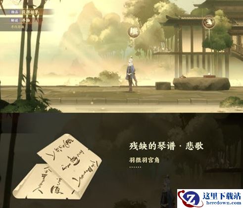 2、向左边走到如图位置就能获得---残缺的琴谱·悲歌。