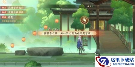 5、然后走到竹林中鸟笼的位置,进行投喂,提示一只比翼鸟唱起了歌。