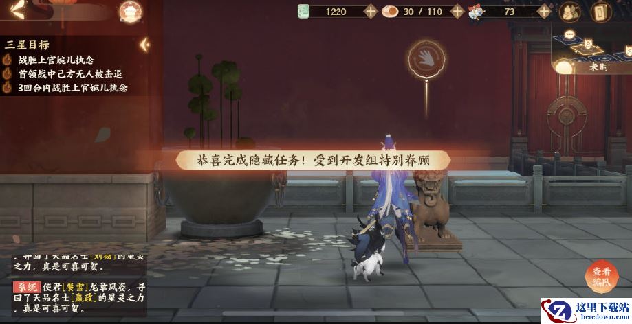 1、来到故世风云普通2-3的第三关中,有个石狮子,连摸10下即可完成开发组隐藏任务。