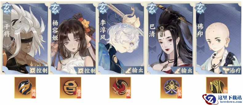群攻方面我们选择李淳风和巴清,巴清的群体增伤实战效果良好,李淳风则是玄卡中非常优质的群攻名士,两位结合打出的伤害较高;
