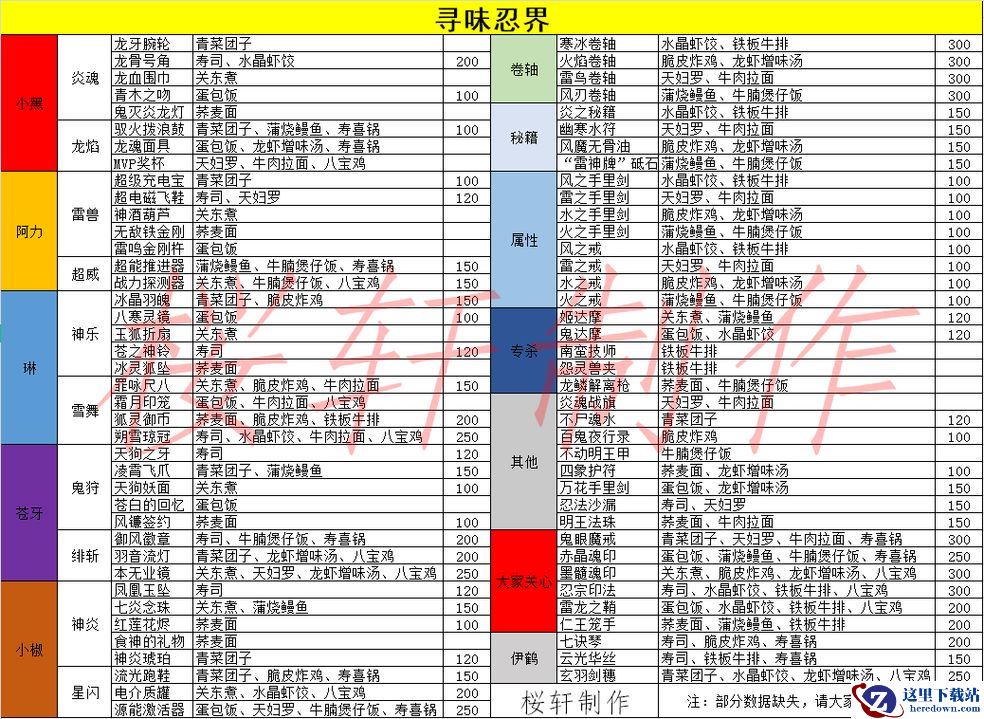 2.对每种美食对应的宝物基本上按照通用→专属、热门→冷门、小黑→阿力→琳→苍牙→小椒→伊鹤、老流派→新流派的顺序进行了排列,并对热门和专属宝物突出显示。
