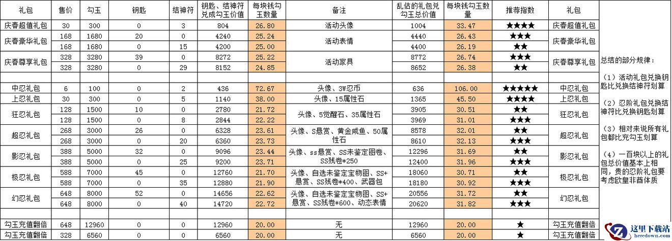 4.一百块以上的礼包总价值基本上相同,贵的忍阶礼包要考虑欧皇非酋体质。