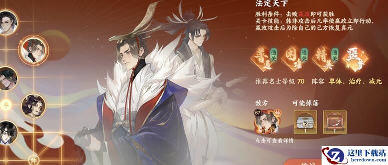 对面的角色等级全部为67级,其实就还好推荐等级为70级,首领为嬴政(将),韩非(士),嵇康(车),王昭君(马),卫青(马)。首先跟大家解释 一下为什么先讲法定天下,因为这是这三周以来,群里公认最恶心的联动轴承本,没有之一啊,因为韩非和嬴政的联动是AOE攻击。韩非作为士,有着当帅受到攻击时,士会反击技能释放单位(也就是100%反击)然后因为现在的队伍,都是单C队伍且大家主养的都是嬴政和李世民。我只能说高练度的嬴政和韩非,双C碾压一下都过去了,但是这个本,简直是单C噩梦。我全员60复活套四保一完全行不同,但凡我当初没洗我大秀宁,我怀疑我这周也单过了。四保一时真的难打这个本。后手有王昭君的减速和嵇康的睡眠关键位置,速度调不好就会导致乱速,或者李清照和袁天罡被控制,也就是根本啥都没干就连死两次。我对这个本的意见就是,有李世民的赌自己暴击加另外一个输出秒掉韩非,即可正常通关。