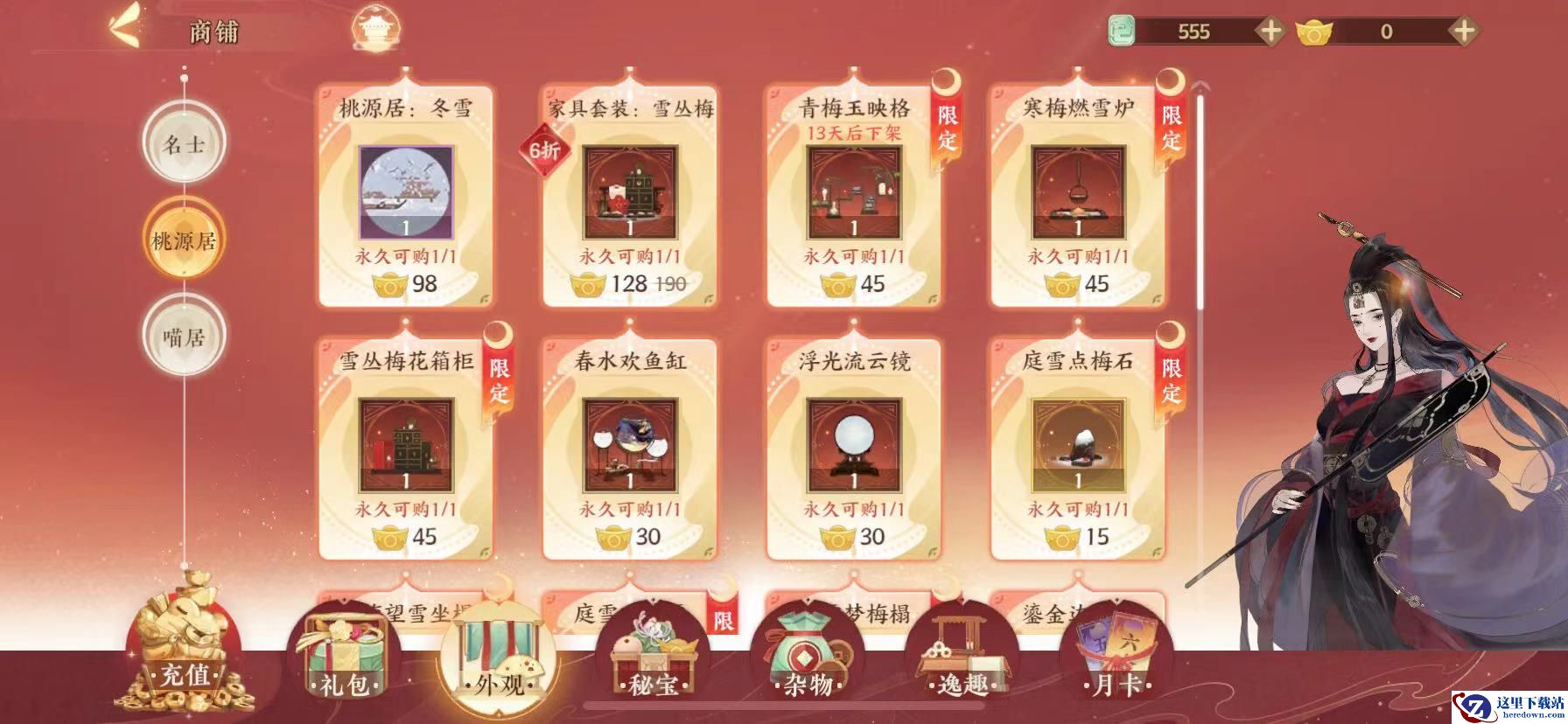 玩家可以尽可能的摆放一些品质高的家具,不过金色品质的家具在游戏中获取难度相对来说也会高出不少,除了平时的名士采购会有几率获取金色品质的家具之外,玩家还可以通过商城购买,在逸趣社中,玩家可以使用玩游戏获得的燕游筹购买家具装饰,人民币玩家也可以使用元宝在桃源居购买限定家具。