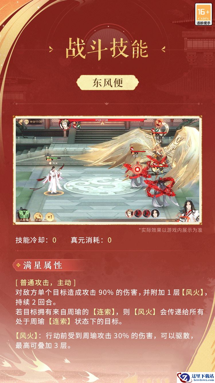 1、普通技能--东风便(普攻)--对1名敌方造成90%伤害,并附加1层(风火),持续两回和。若目标拥有(连锁),则(风火)会传递至所有处于周瑜(连锁)状态下的目标。
