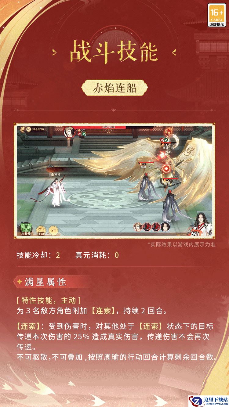 2、特殊技能--赤焰连船(主动,冷却2回合。)--为三名敌方名士附加(连锁),持续两回合。