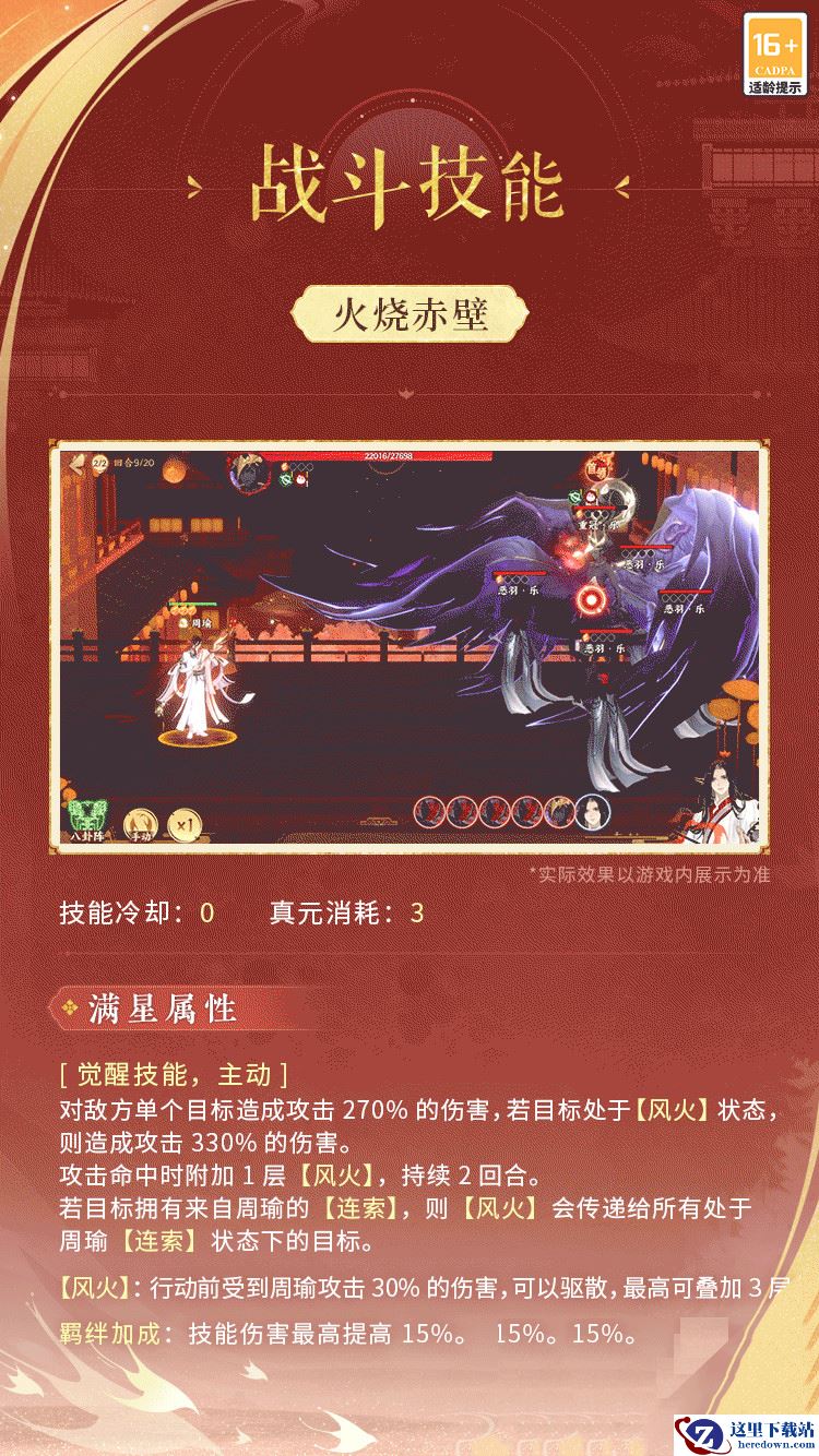 3、觉醒技能(3火)--火烧赤壁(3火觉醒)--对敌方单体目标造成270%的伤害,若目标处于(风火)状态,则造成330%的伤害。攻击命中时附加1层(风火),持续2回合。
